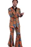 Cooler Hippie Look, sexy Jumpsuit mit floralem Print. Gerne bieten wir Ihnen auch dazu passende Plateauschuhe und Perücken an.