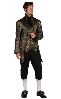 Der Zauberer unter den barocken Kostümen! Das Kostüm besteht aus einer, dazu der seidige schwarze Gehrock mit goldenen Ornamenten. Dazu bieten wir weiße Kniestrümpfe, Schuhschnallen, Dreispitz oder Perücke an.